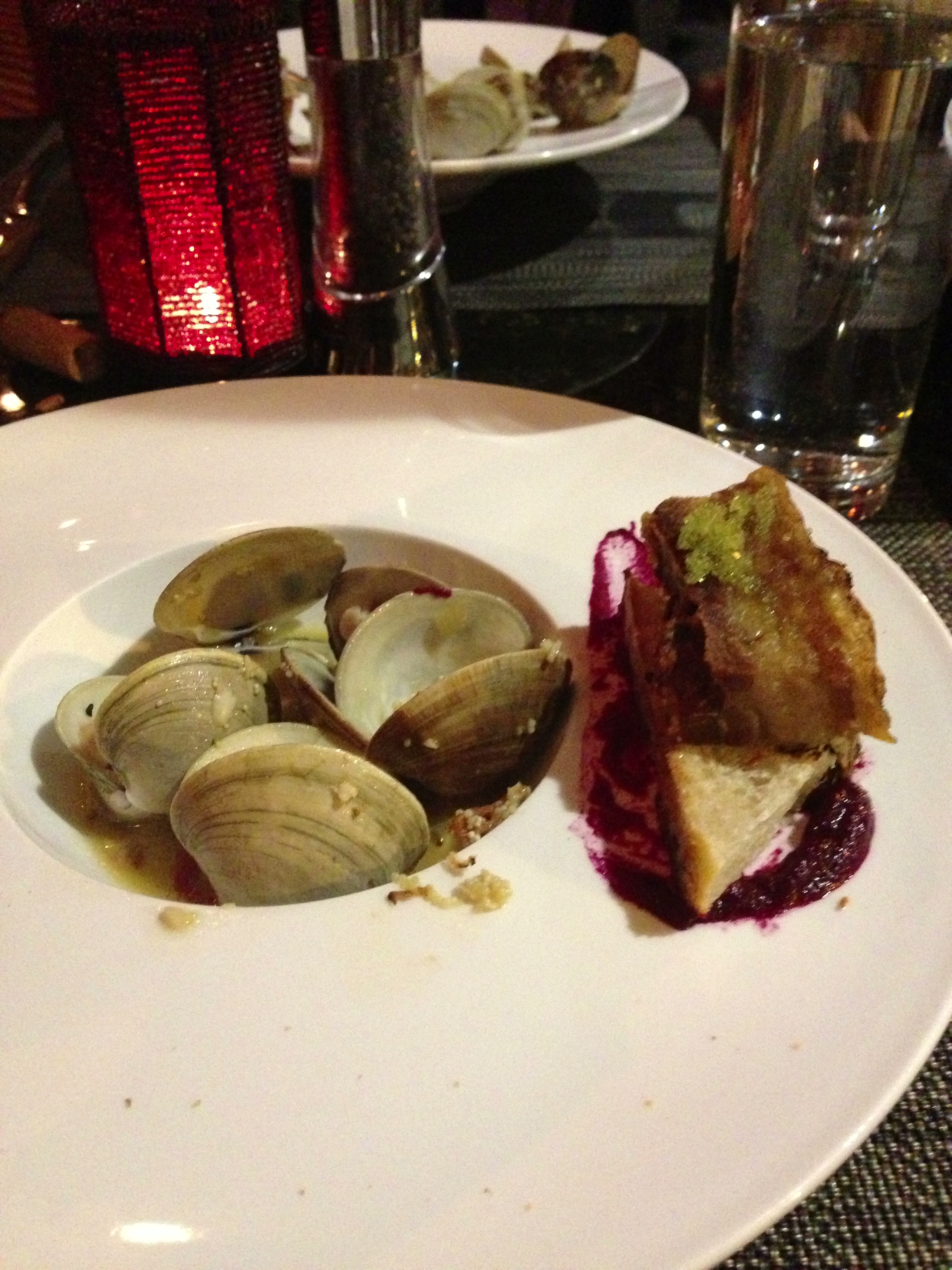 IMG_2478-2 Steamed clams in wasabi and smoked bacon sauce. Served with pork belly and ciabatta over beet puree.